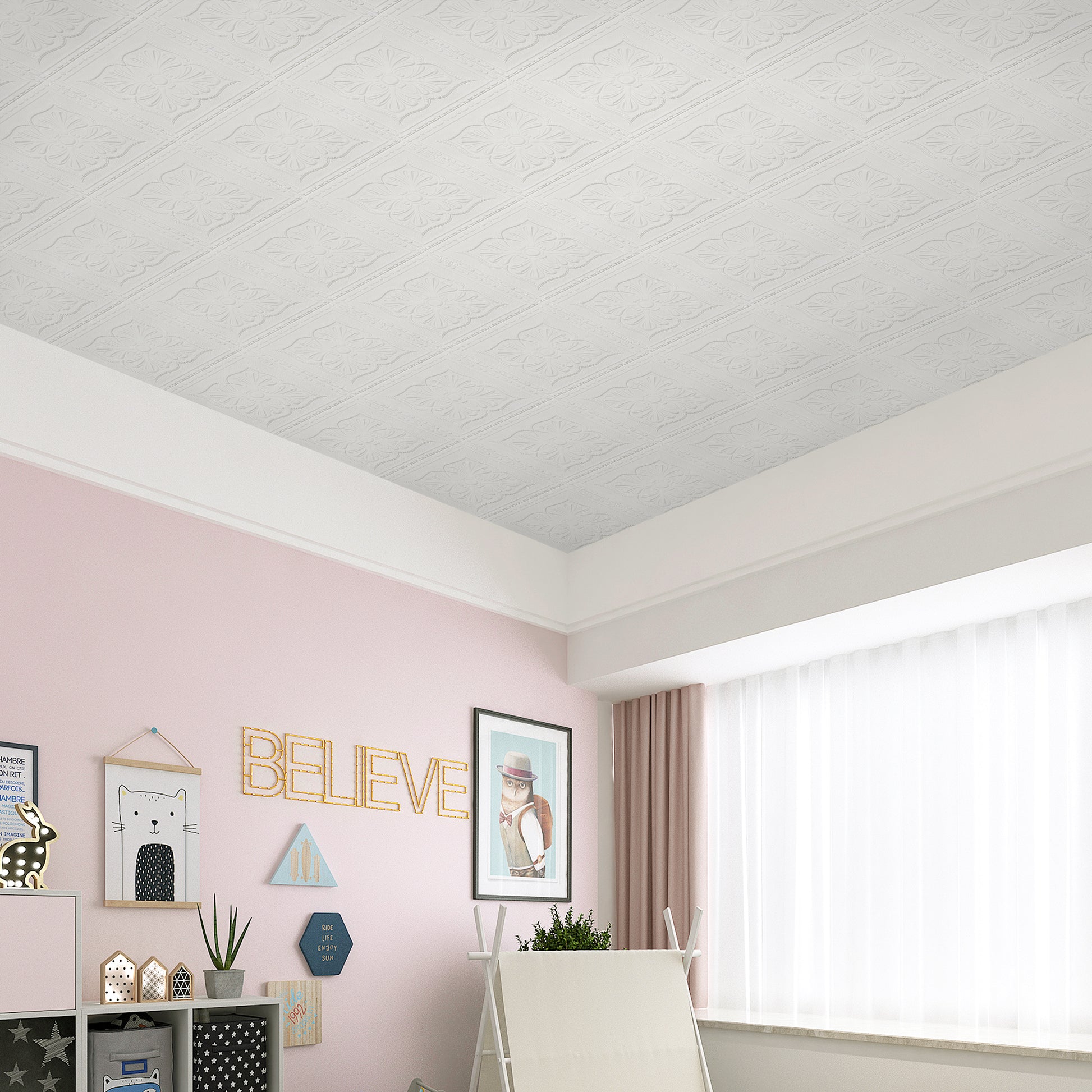 Abyssaly peel and stick ceiling tiles are made of PVC, a lightweight and durable material that is also easy to cut to fit many types of ceilings. The surface of the ceiling tiles is water and stain resistant, providing excellent protection for ceilings and walls. Easy to clean, ensuring long-lasting beauty. Measuring 13.7x13.7 inches (approximately 35.0x35.0 cm), one package occupies approximately 20.96 sq. ft. and can be purchased by calculating the square footage of the roof.Abyssaly Ceiling Tiles are easy to install and peel and stick. Simple and generous design shows the atmosphere, versatile, not only for the ceiling, but also can be used in the living room, bedroom, kitchen and other rooms of the wall.