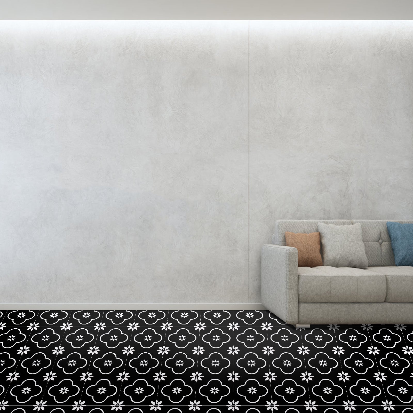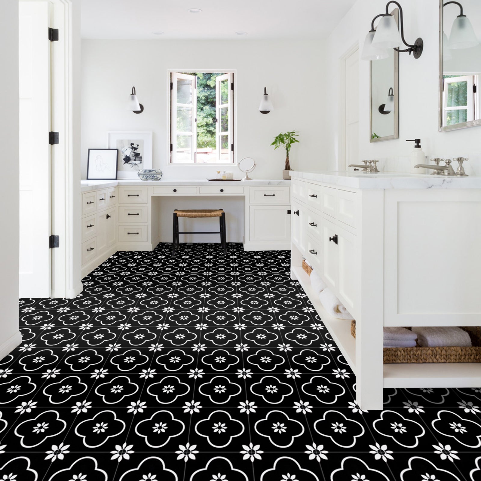 The black and white geometric design will add modern detail to any room in your home. Our black peel and stick floor tiles have a nice layer of adhesive on the back, which not only makes them self-adhesive (no need for additional glue), but they peel off easily without damaging the subfloor. Simply peel and stick!
