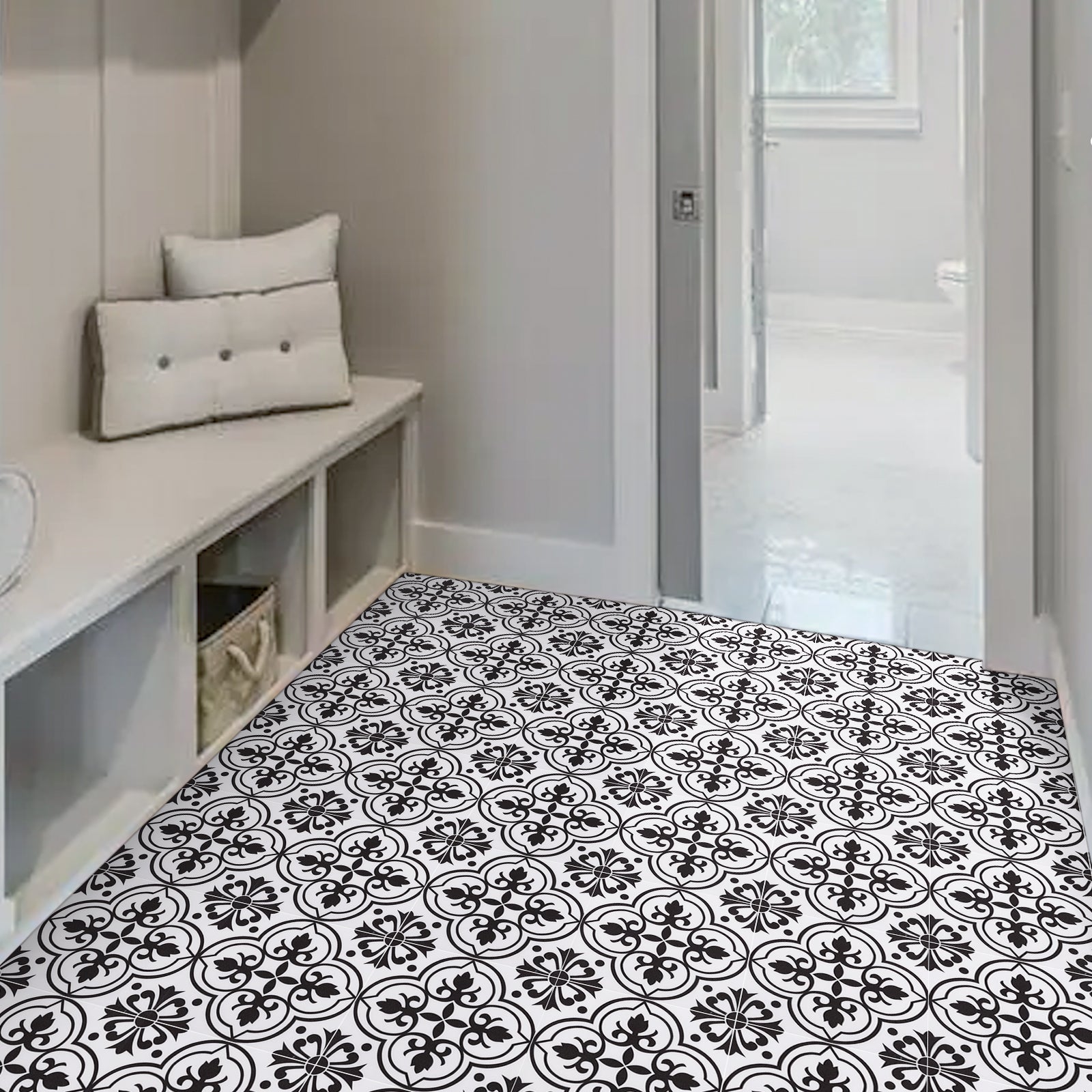 Crisscrossing lines give the look of an intricately tiled floor. The black and white geometric design will add modern detail to any room in your home. Our peel and stick floor tile has great adhesive layer on the backing, which not only makes it self adhesive (no need extra glue), but it can be removed easily with no damage to underlying floor. Just peel it off and stick! Each tile measures 11.8 inches x 11.8 inches,There are 10 tiles per box.