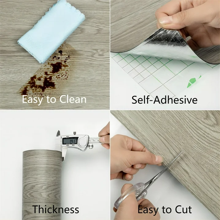 The design of wood plant textured looks like real wood grain and suitable for the floor of bedrooms, living rooms, kitchen, lounge, RV, office and so on. Any dust-free flat surface can be applied, such as marble, wood, terrazzo, concrete etc.