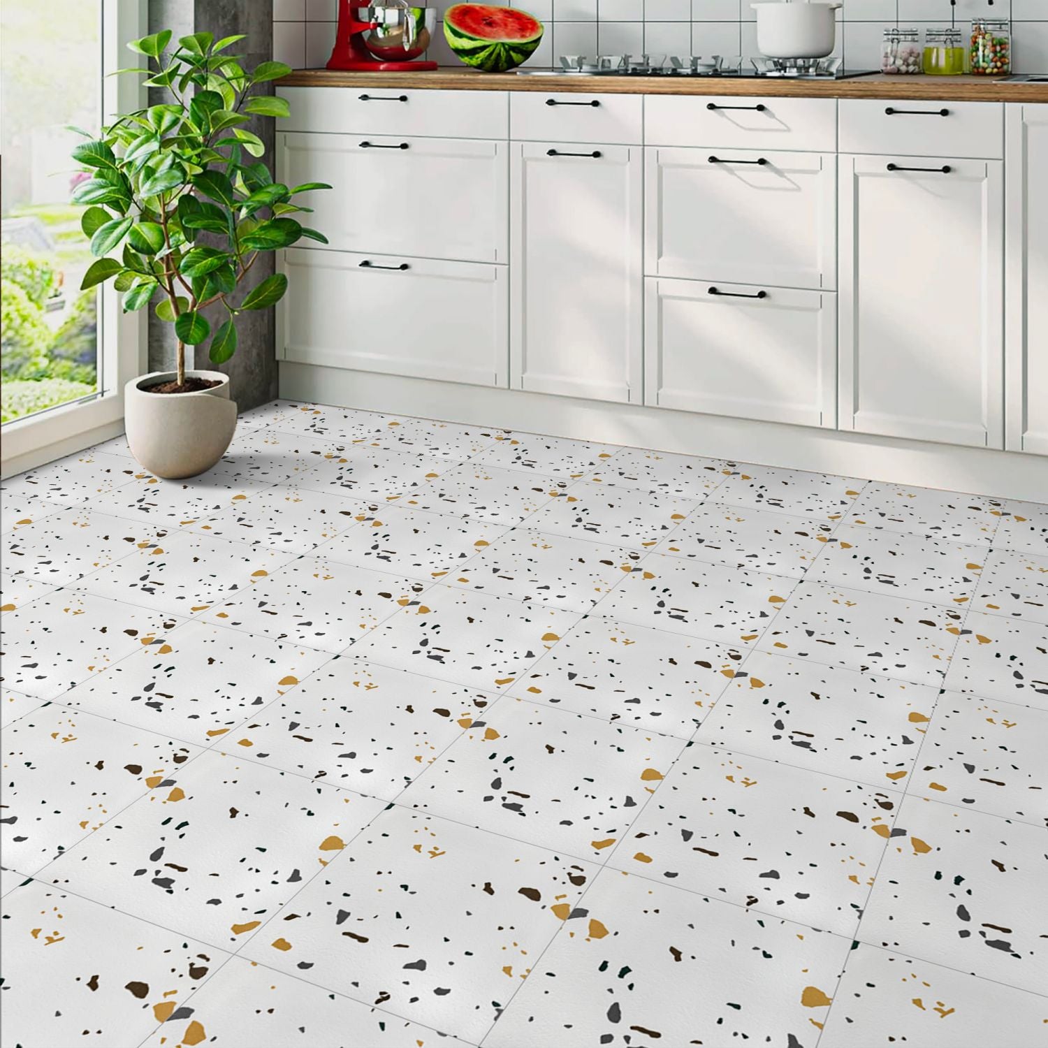There is a white marble appearance with a self-stick floor, which can bring you a new decoration experience. Each peel and stick tile is 11.8 In X 11.8 In, there are 10 pieces per package, covering an area of 9.6 square feet.
